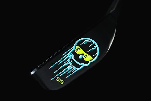 Finished in a black pvd coating with an oversized Chicago blue dripping skull with volt sunglasses engraved on the sole. Along with a matching black and Chicago blue Lamkin grip, to round out our second rendition of the Retro putter.