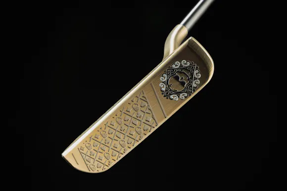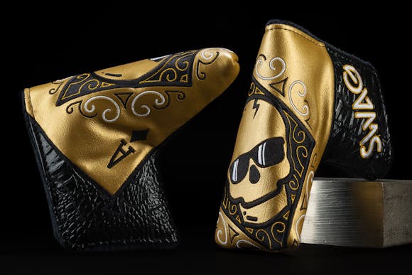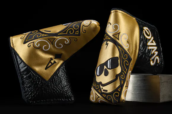 The smooth, 100% machined, never bent 1/2 offset flow neck of this putter inspires confidence as your eye travels down it. Hand-finished with a unique Gold Torch process, the putter's sheen highlights the precision mill patterns and 3D surfacing that SWAG is renowned for. A recessed skull, meticulously hand-painted in white and black, adorns the sole, while the face features a distinctive pocket Ace engraving and the back proudly displays the SWAG logo.